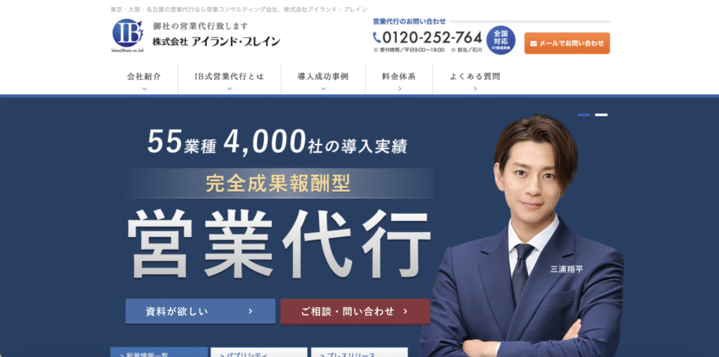 株式会社アイランド・ブレインは、55業種以上・3,000社以上の実績を持つBtoB営業の新規開拓に特化した営業代行会社です。完全成果報酬型の料金体系を採用している点が大きな特徴です。