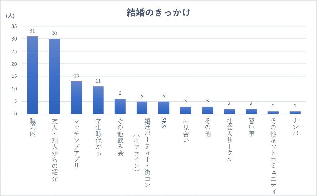 「職場内での出会い」や「友人・知人からの紹介」など身近なところで出会った方が多いように感じます。4位についている「学生時代から」とも合わせると全体の63%にも上ります。
