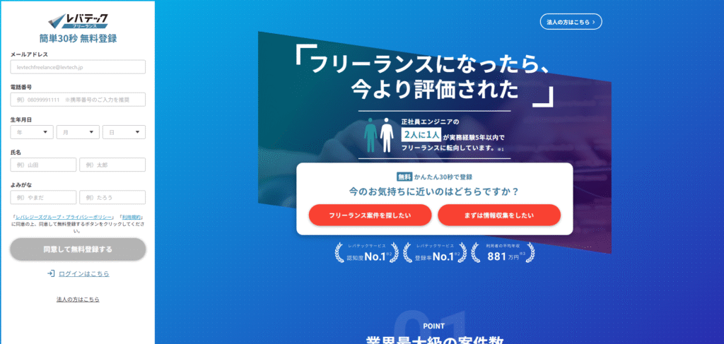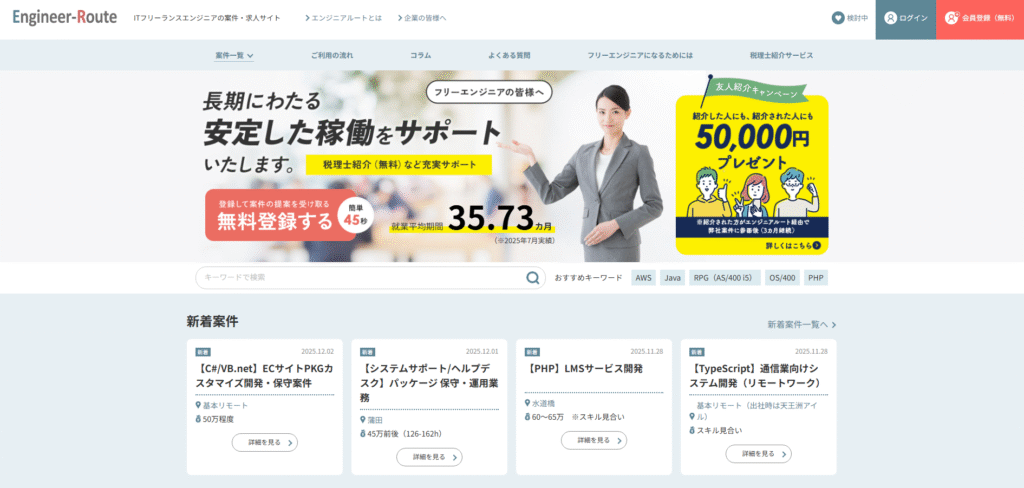 案件数ではなくエンジニア個人のスキルや希望に合わせてマッチングするため、希望に合った良質な案件を紹介してもらいやすいのが特徴です。長期・安定案件や交渉支援、税務・法律サポートの紹介など、フリーランスとして安定した働き方を目指す人に向いています。