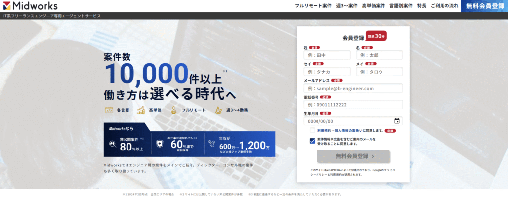 Midworksは、IT系フリーランスエンジニアに特化したエージェントサービスです。約10,000件以上の案件から、言語・スキル・勤務形態(リモート、週3〜5日など)まで幅広く対応。