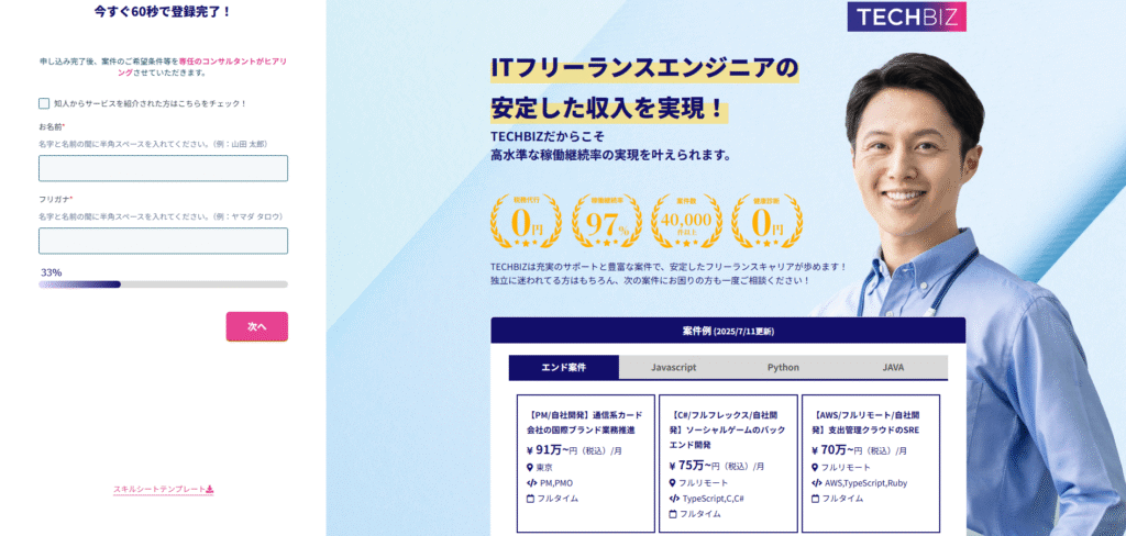 TECHBIZ は、ITエンジニア・デザイナーなどフリーランス人材と企業とのマッチングを通じて、理想の働き方を支援するエージェントサービスです。