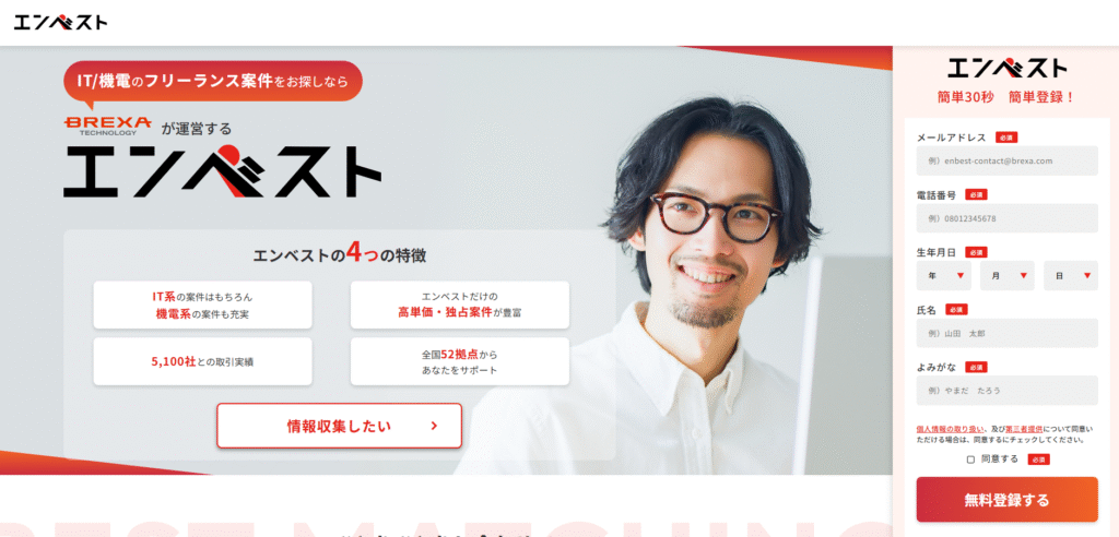 エンベストは、高単価・リモート中心のITフリーランス案件を紹介するエージェントです。