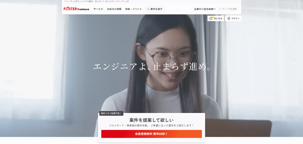 フォスターフリーランスは、エンジニア向けの常駐・リモート案件を扱うエージェント。