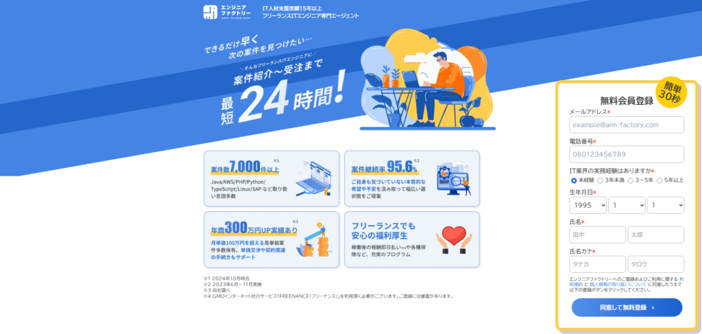即稼働可能な案件も多く、最短数日で参画できるスピード感が魅力。高単価案件と手厚いフォロー体制により、経験豊富なエンジニアから高い支持を得ています。