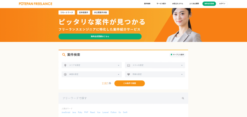 ポテパンフリーランスは、開発・デザイン・ディレクションなど幅広い職種の案件を扱うエージェント。