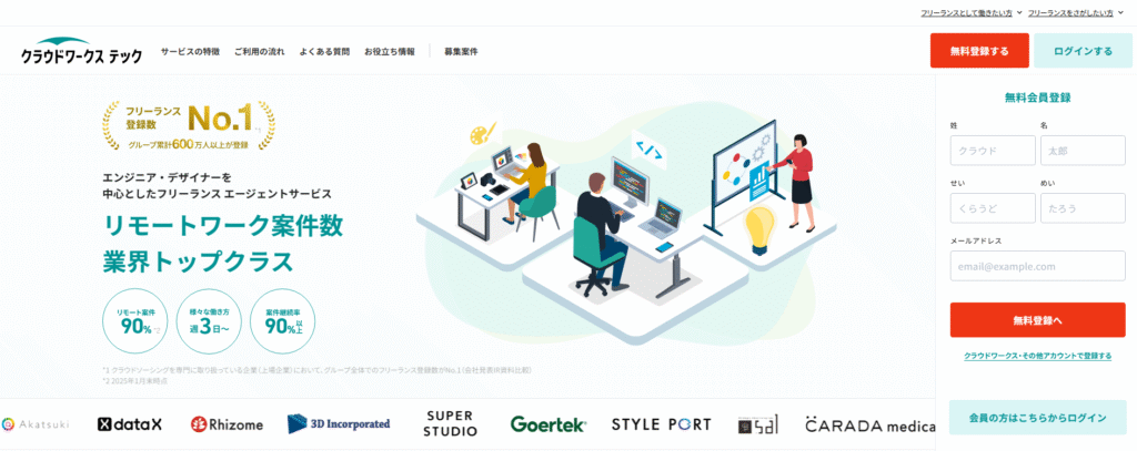大手・上場企業の直請け案件も多く、福利厚生や所得補償など「フリーランスでも安心」なサポート体制が整っており、安定と高収入を両立したいエンジニアに向いています。