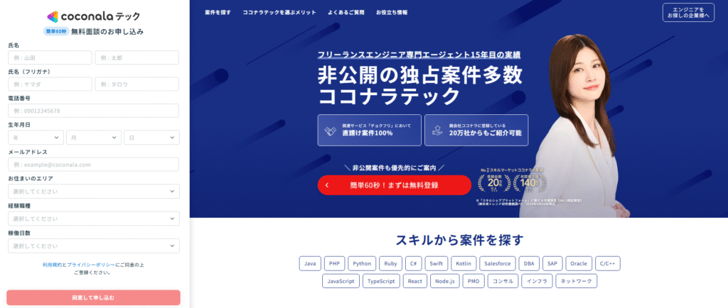 ココナラテックは、直請け・高単価案件に強いフリーランスエンジニア向けエージェントです。