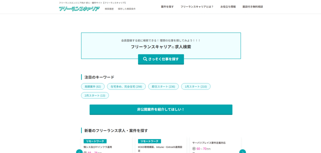 フリーランスキャリアは、ITエンジニア・クリエイター向けの求人・案件紹介サイトで、2,000件以上の公開案件と高単価のリモート/在宅案件を多数掲載。専任コーディネーターによる無料カウンセリングと案件紹介で、営業不要・スキル・希望条件に合った案件を提案してくれるのが特徴です。