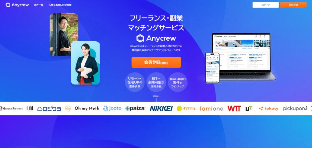 Anycrewは、エンジニア・デザイナーだけでなく、マーケティング・営業・バックオフィスなど幅広い職種のフリーランス/副業案件を扱うマッチングプラットフォームです。