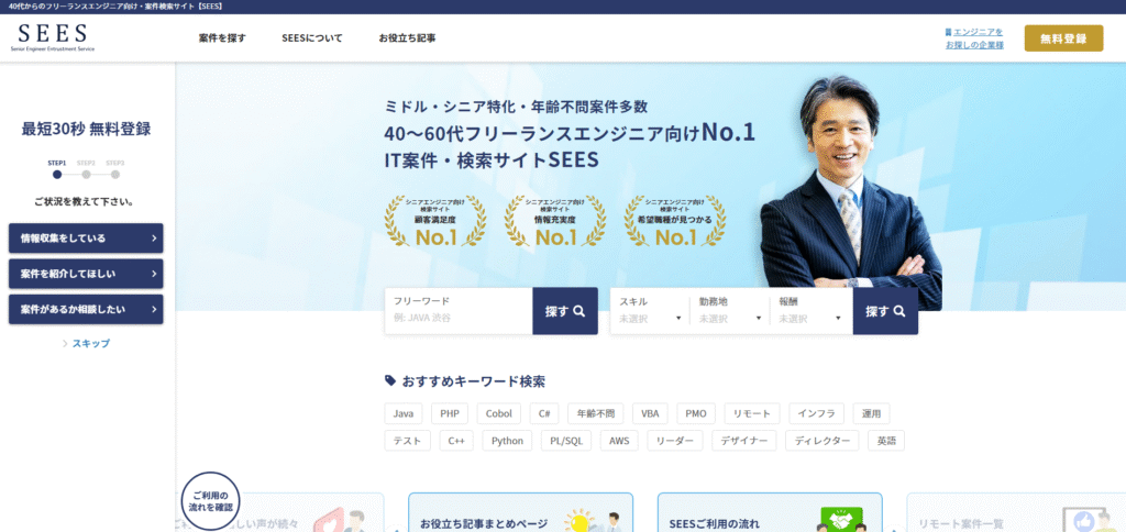 SEESは、40〜60代などミドル・シニア世代のフリーランスITエンジニアに特化した案件紹介サービスです。年齢不問・経験重視の案件を豊富に揃え、5,000社以上との取引企業ネットワークから、未公開の高単価・安定案件を紹介。