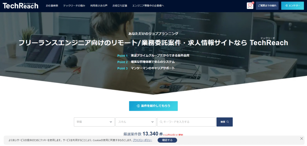 TechReachは、フリーランス/個人事業主のITエンジニア・クリエイター向けに、業界大手・メガベンチャーなどから直請けで高単価案件を紹介するプラットフォームです。