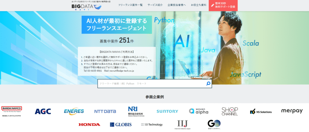 BIGDATA NAVIは、人工知能(AI)・データ分析・データサイエンティスト領域に特化したフリーランス/副業求人サイトです。