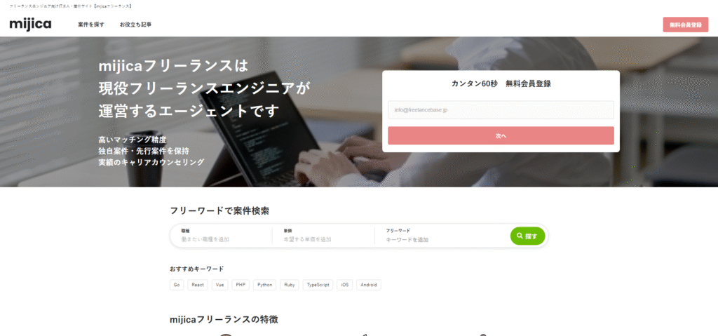 mijicaフリーランスは、フリーランス/業務委託向けに多数の求人・案件を扱うマッチングサイトで、約 2,700件以上の案件が常時掲載されています。