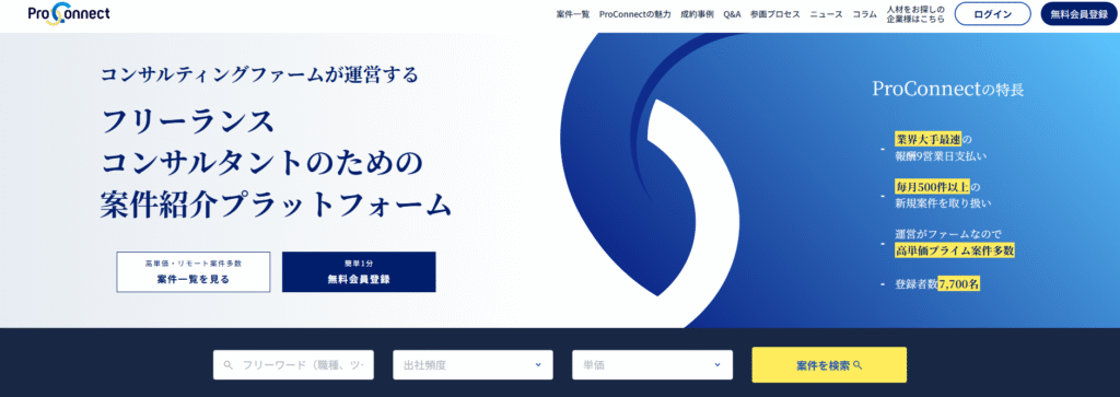 ProConnect は、コンサルタント・PMO・ITコンサル領域に特化したフリーランスマッチングプラットフォームで、高単価かつハイクラス案件が中心です。
