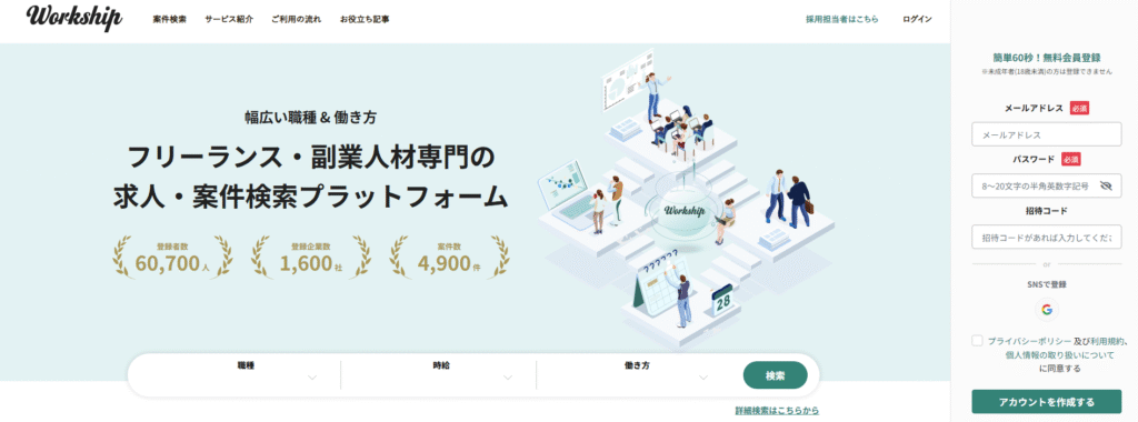 Workshipは、エンジニア・デザイナー・マーケター・編集者など、幅広いデジタル職種のプロと企業をつなぐフリーランス/副業向けマッチングサービスです。