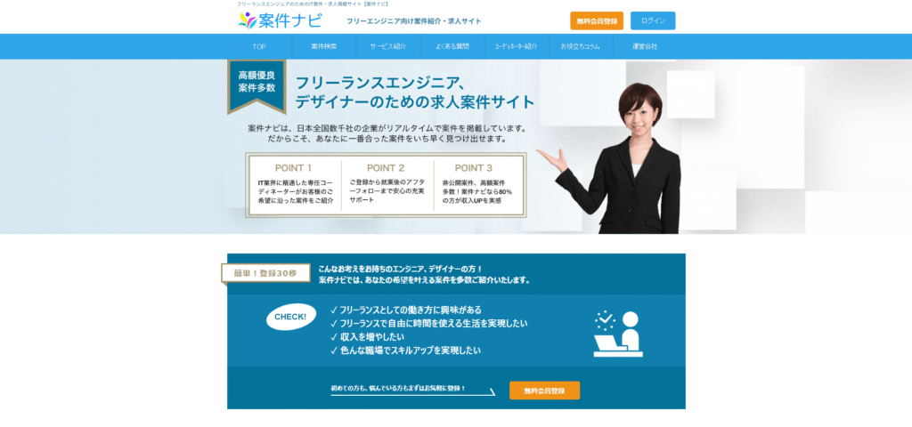 案件ナビは、フリーランスのITエンジニアやWebデザイナー向けの求人・案件紹介サイトです。全国の企業から2000件以上の常時公開案件を掲載しており、Java/PHP/C#などの開発案件からインフラ、デザイン案件まで幅広く対応。