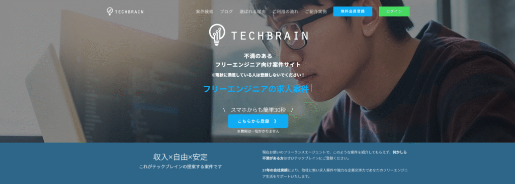 テックブレインは、IT/Web系フリーランスエンジニアに向けた求人・案件紹介サービスで、常時5,000件以上の高単価案件を保有しています。