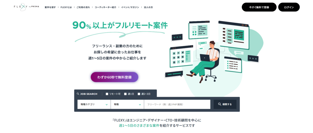 FLEXYは、エンジニア・デザイナー・CTO・技術顧問者などハイスキル人材を対象としたプロ人材マッチングサービス。