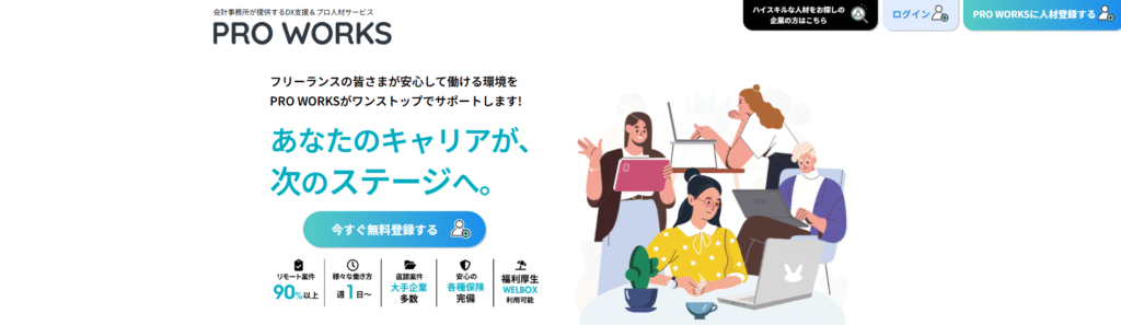 PRO WORKSは、直請け案件を多数扱うフリーランス向けエージェントで、大手商社グループ案件、AI/DX関連の先端案件、チーム体制での請負など、多様な働き方を提供。
