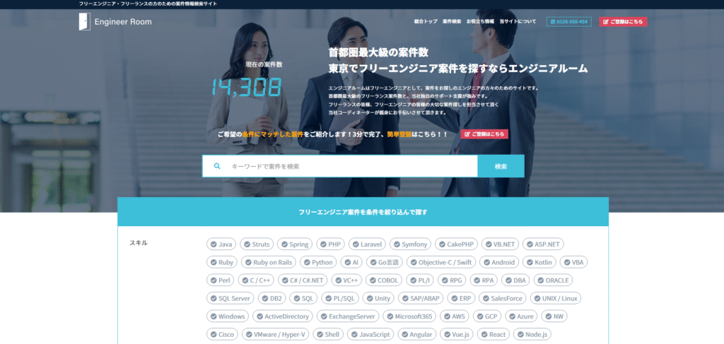 エンジニアルームは、首都圏を中心にフリーエンジニア向けの案件を広く扱う求人サイトで、月あたり約5,000件の案件を公開する「首都圏最大級」の案件数が特徴です。