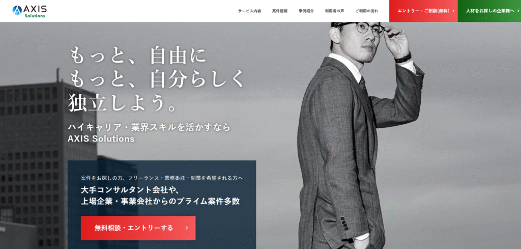 アクシスコンサルティングは、フリーランスコンサルタントやIT・DX人材向けに、高単価・直請け案件の紹介を行うエージェントサービスです。