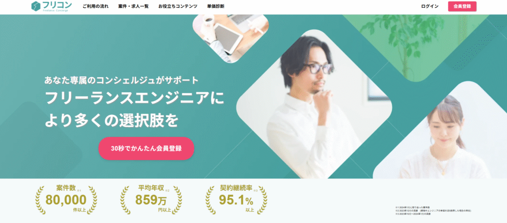 フリコンは、ITエンジニアを中心としたフリーランスと企業を結ぶエージェントサービスです。
