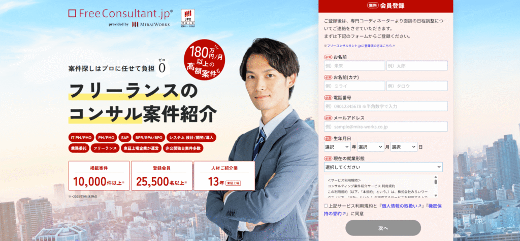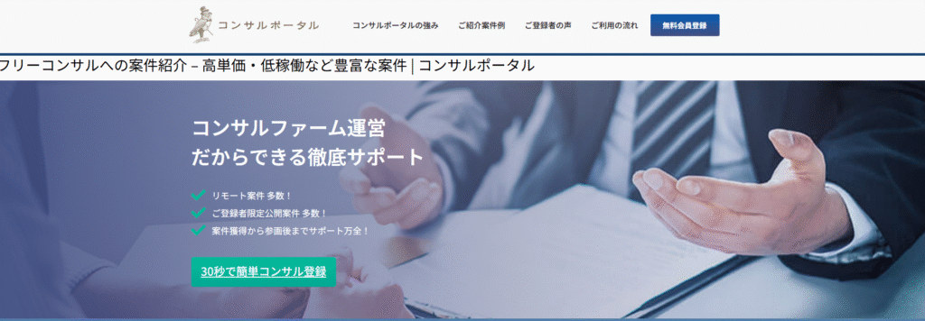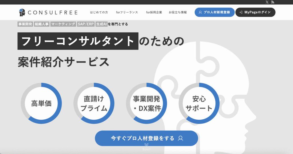 Consulfreeは、ITコンサルタント領域に特化した案件紹介サービスで、高単価案件の豊富さに定評があります。