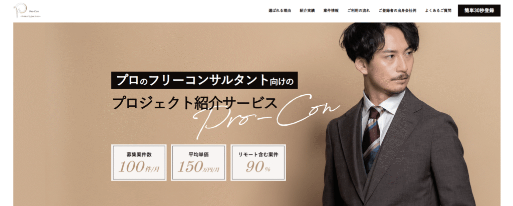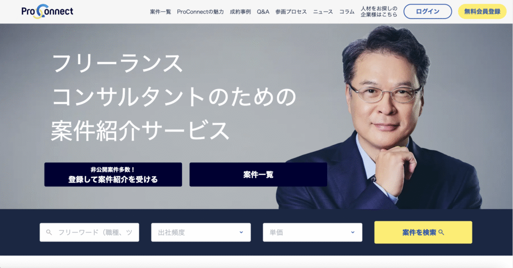 ProConnectは、外資・大手コンサル出身者が運営するフリーコンサル向け案件紹介サービスで、専門性の高い案件が多い点が特徴です。