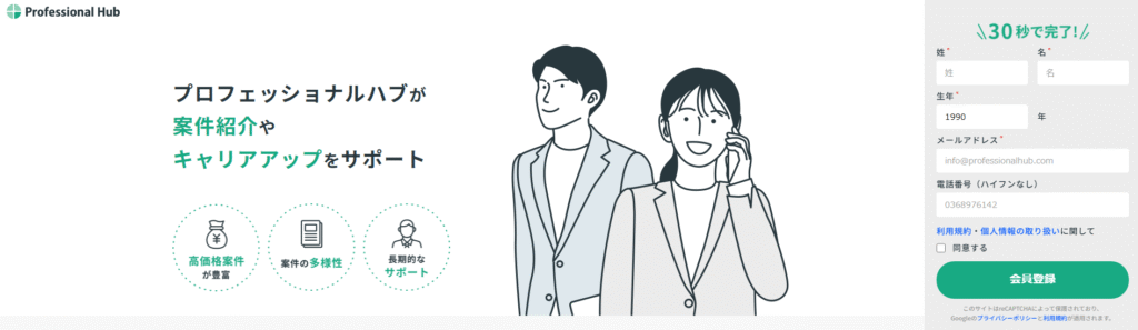 Professional Hubは、大手企業やSIer直請け案件を多数扱うフリーコンサル向けエージェントです。月120万円以上の案件が多く、キャリアアップを目指す方に最適です。