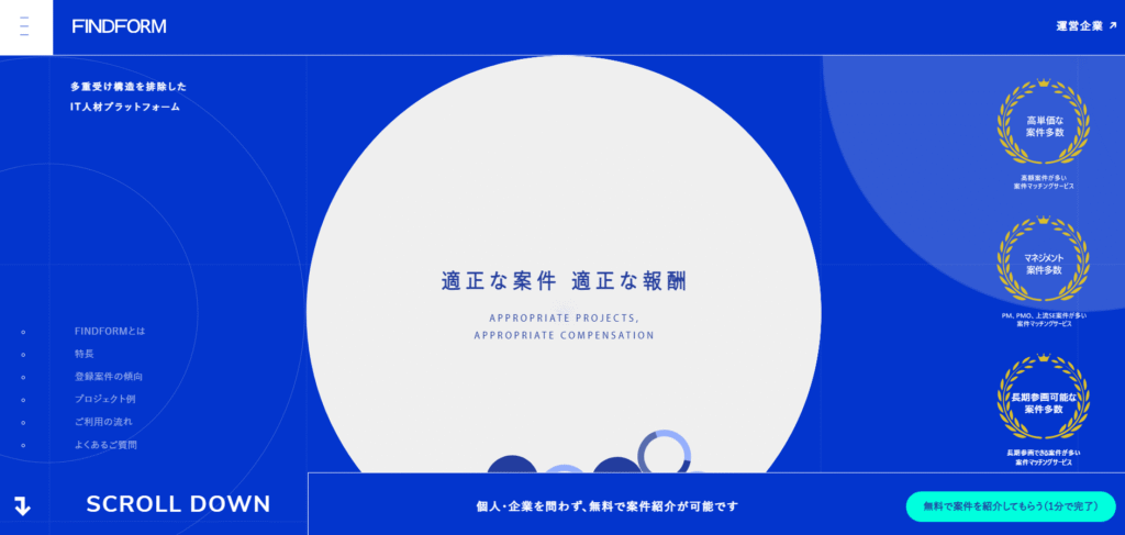 FINDFORMは、IT・Web系フリーランス向けの案件紹介サービスです。リモート案件が豊富で、専任担当による条件交渉やキャリア相談のサポートも充実しています。