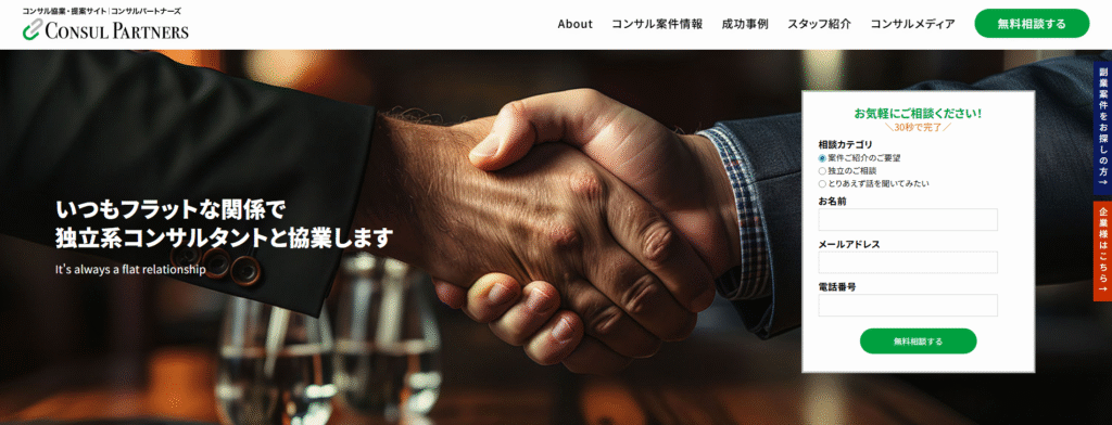 コンサルパートナーズは、企業とフリーコンサルタントの協業を重視したパートナー型の案件紹介サービスです。