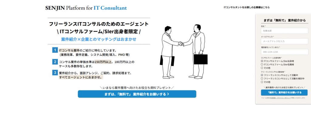 SENJIN Platform for IT Consultantは、ITコンサル・PMO向けの高単価案件を専門に扱うマッチングサービスです。要件定義やシステム導入支援など上流工程の案件が多く、月150万円超の案件も豊富です。