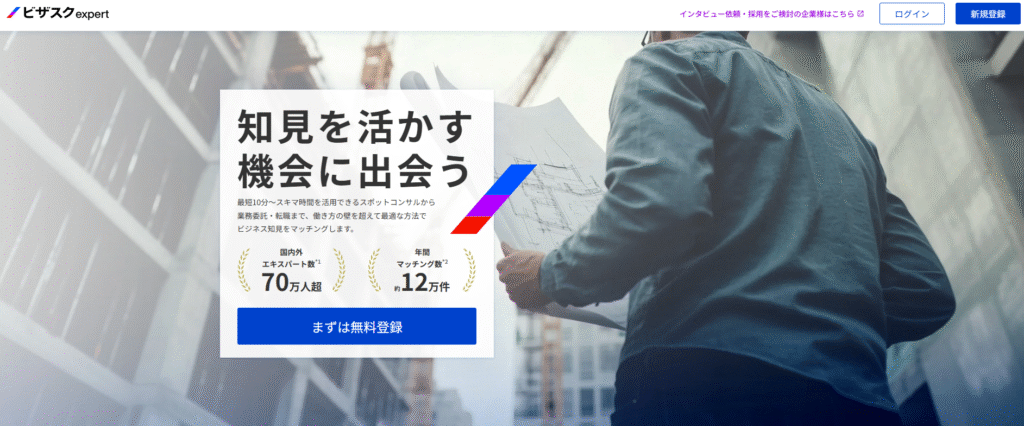 ビザスクexpertは、スポットコンサルや業務委託案件を中心に、専門知見を活かして収益化できるマッチングサービスです。