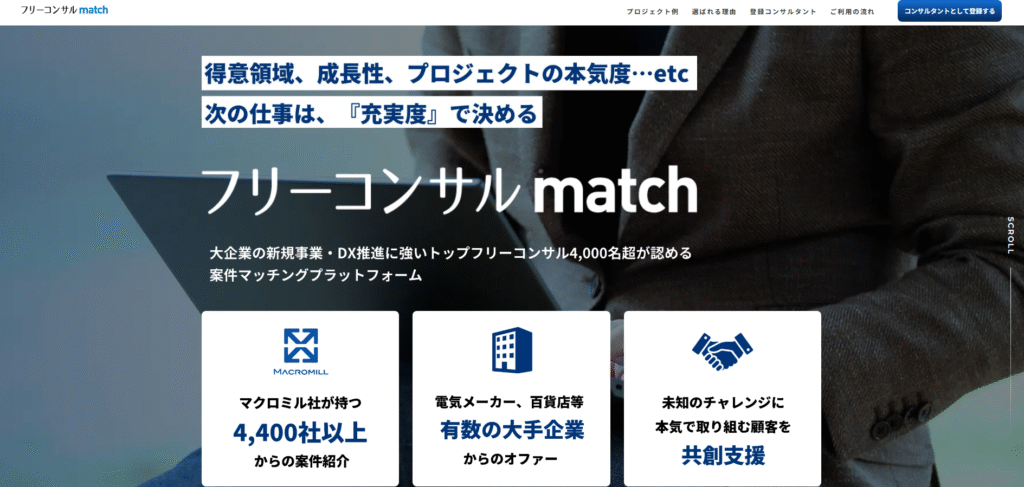 フリーコンサルmatchは、プロジェクト型・社員代替型・アドバイザー型の3方式からマッチングするフリーコンサル向け案件紹介サービスです。