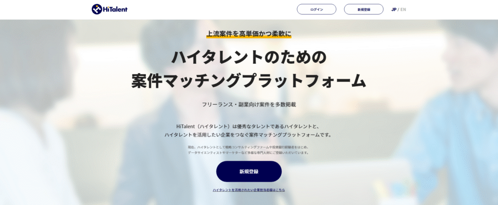 HiTalentは、コンサルファーム・投資銀行・外資系企業などでのハイスキル経験を持つ人材と、質の高い企業案件をつなぐマッチングプラットフォームです。