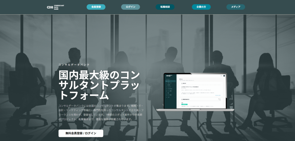 コンサルデータバンクは、スポットコンサル(1時間単位)から中長期案件、転職案件まで幅広く対応するマッチングプラットフォームです。