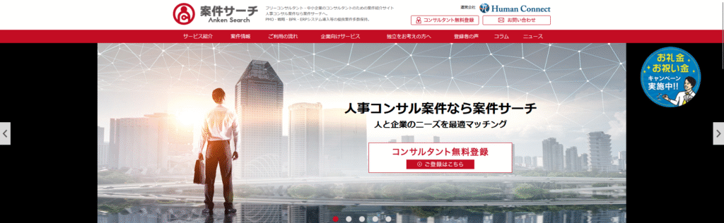 案件サーチは、人事コンサルを中心に、PMO・戦略・ERP導入などの優良案件を提供するフリーコンサル向けマッチングサービスです。