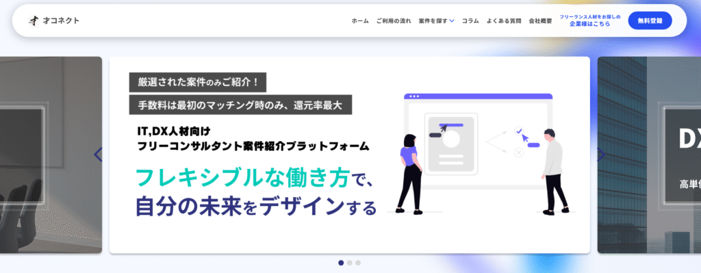 才コネクトは、案件紹介機能に特化したフリーコンサル/ITフリーランス向けプラットフォームです。
