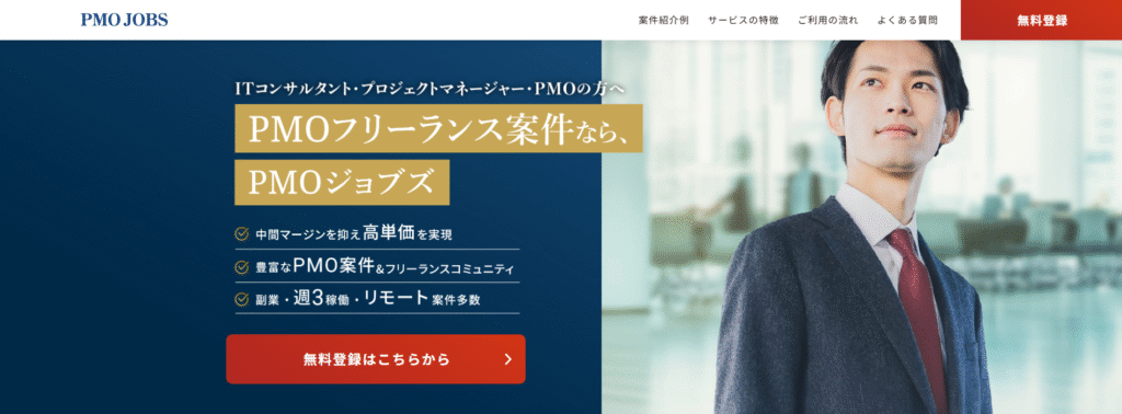 PMOジョブズは、PMO・システム導入・DX 推進プロジェクトに特化した、フリーコンサル/PMO向けのマッチングサービスです。