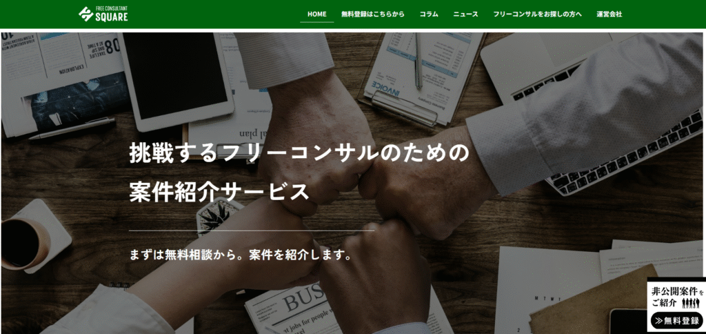FreeConsultant-Squareは、フリーコンサルタント向けに案件紹介サービスを行うプラットフォームです。