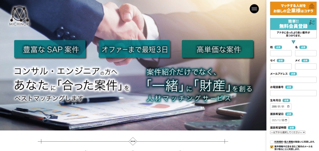 Michinoriは、経営・DX・業務改善などの案件を中心に、フリーランスコンサルタントと企業をつなぐマッチングサービスです。上流案件が多く、スキルを活かして高収入を目指せます。
