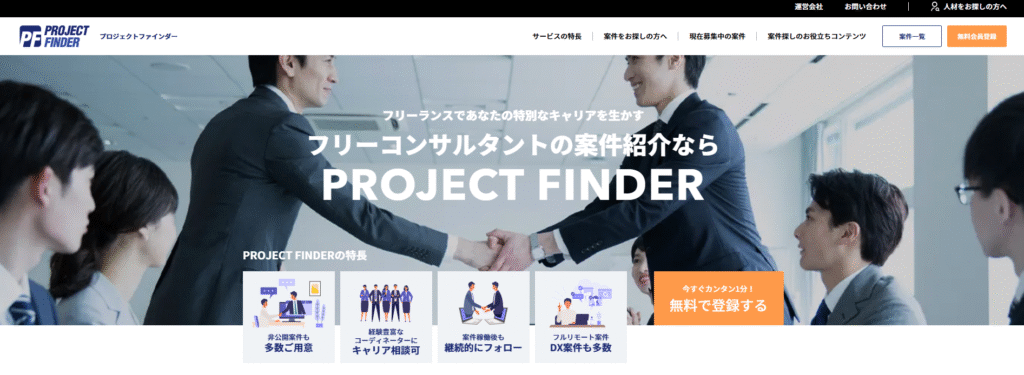 PROJECT FINDER は、主にコンサル/SAP/DX/PMOなどを対象としたフリーランス案件紹介サービスで、非公開案件を多数保有。