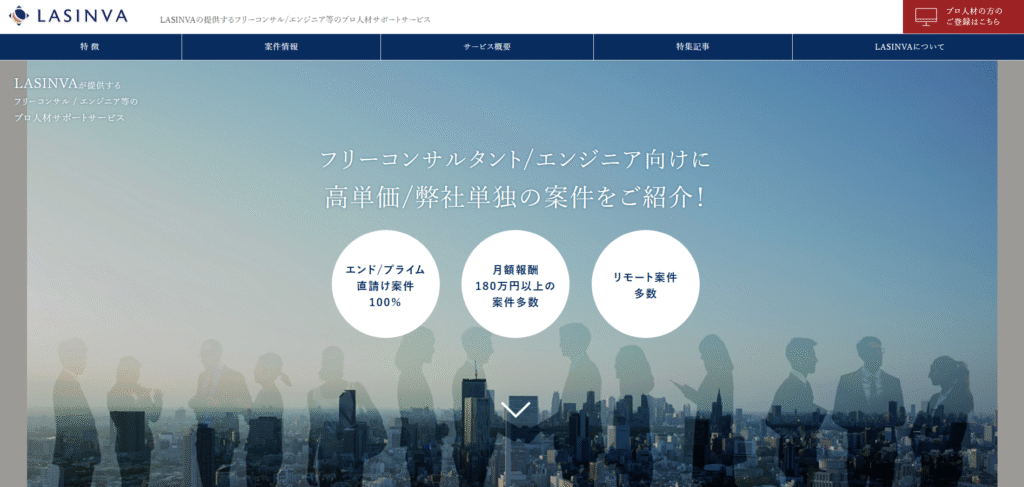 LASINVAは、コンサル/エンジニアなどプロ人材向けに、直請け・プライム案件を中心とした高単価案件を紹介するサービスです。