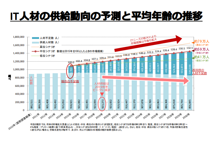 以下のように「経済産業省」でも、2030年までIT人材不足が深刻化し続け、最大80万人規模で人材不足に陥るとさえ記されています。