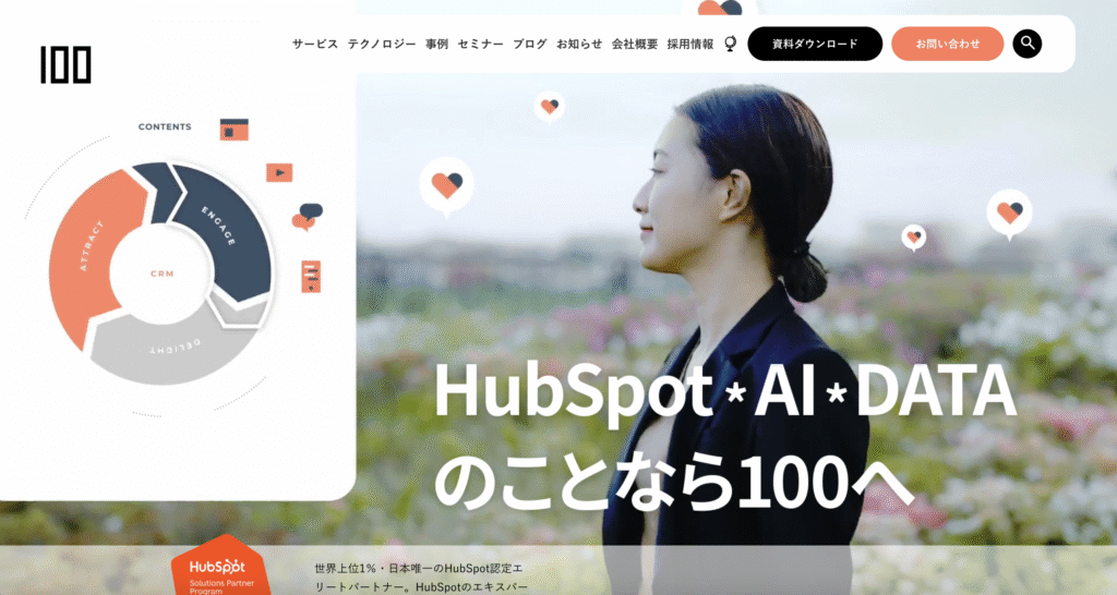 株式会社100は、HubSpotを中心としたマーケティング支援やCRM導入コンサルティングを提供している企業です。