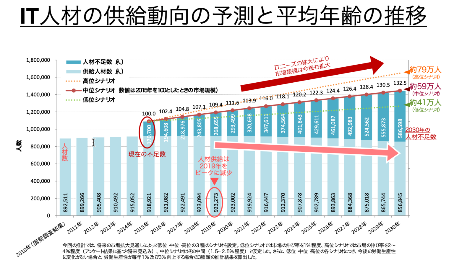経済産業省が発表した「IT人材育成の状況等について」のデータによると、2030年までにIT人材は少なくとも約40万人、多くて約80万人不足すると予測されています。