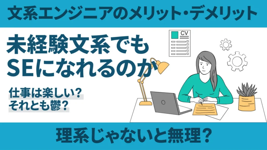 未経験で文系出身だけどSEになれるのかな…? このような悩みを持つ文系の方は多いのではないでしょうか。今回はそんなお悩みを持つ方に向けて、下記の内容をお届けします。 未経験の文系がSEになれるのか 未経験がSEになるための方法 文系エンジニアのメリ... -